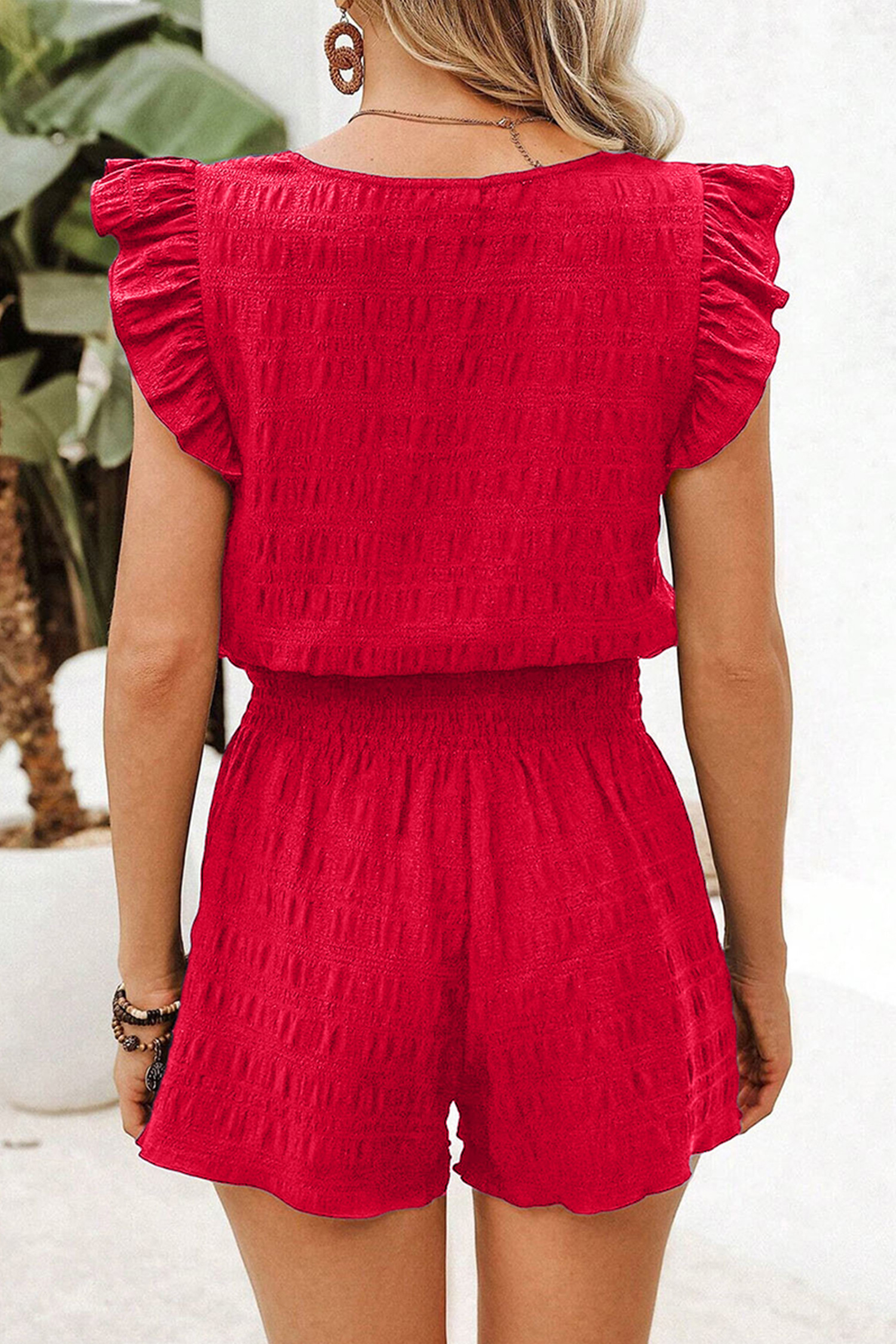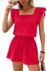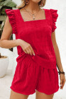 鮮やかなレッドのテクスチャードスクエアネックトップスとシャーリングハイウエストショーツセット