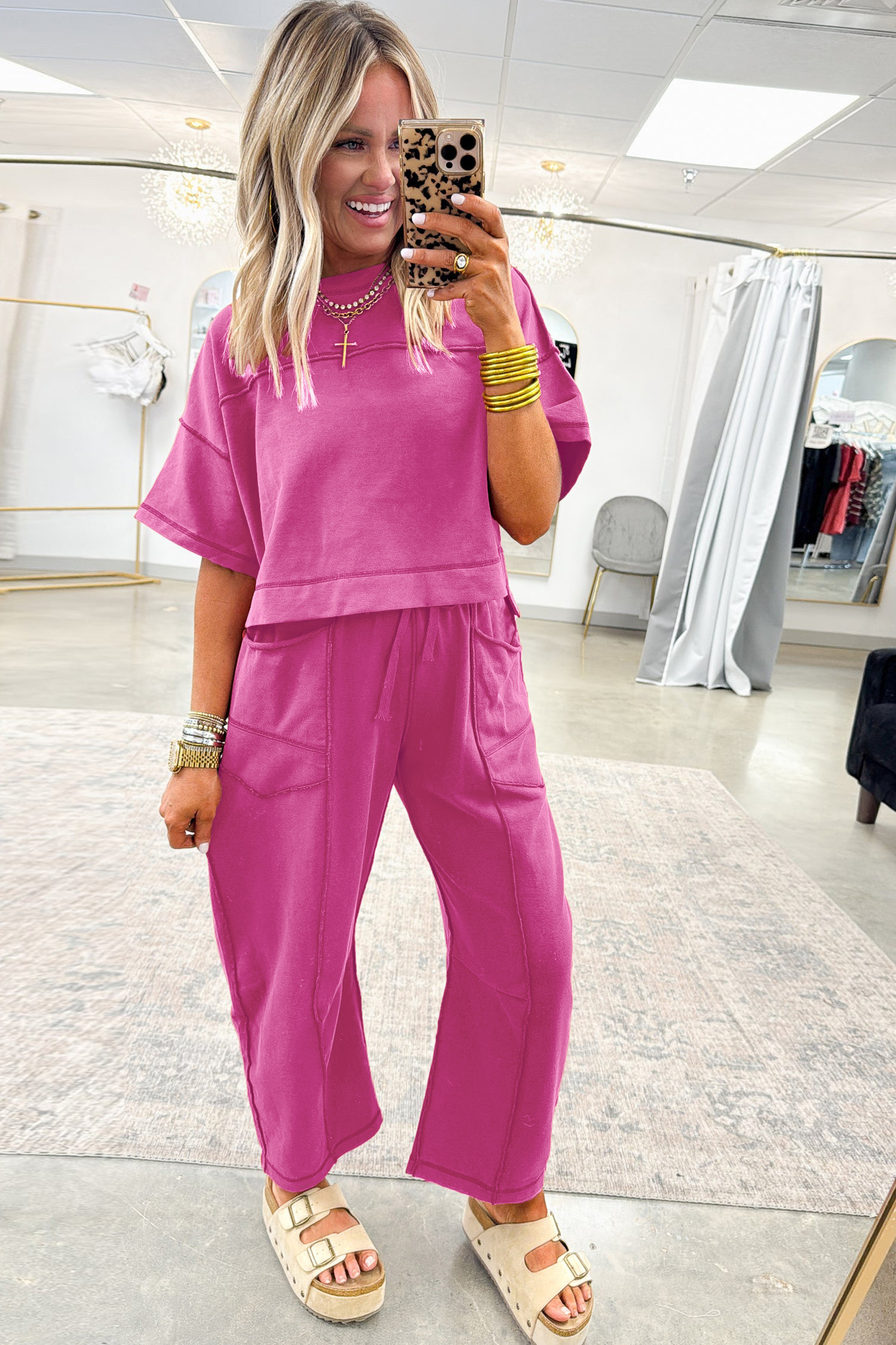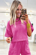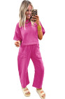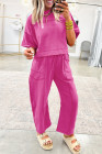 ローズレッドドロップショルダーボックスTシャツとバレルパンツのセット